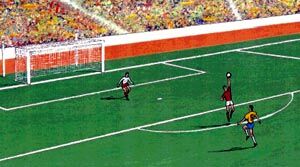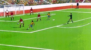 Мяч посылается в направлении ворот атакующей командой, а защитник прыгает и играет