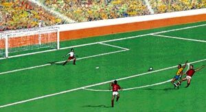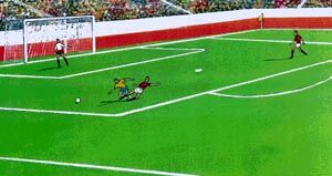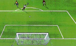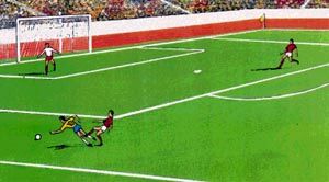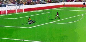 Атакующий игрок, направляющийся к воротам, задерживается вратарем. Вратарь